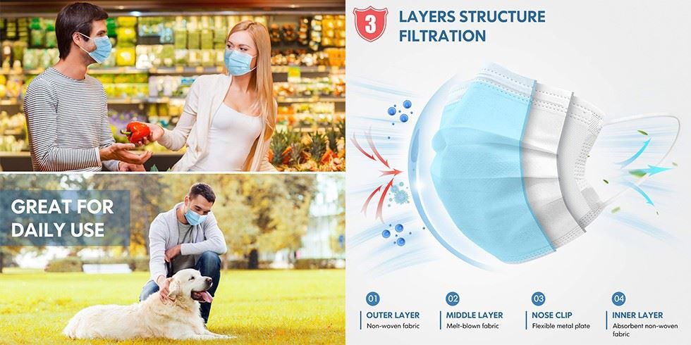 【3 ochranné vrstvy】 Vnější barevná vrstva - vrstva blokující vodu, která blokuje stříkající kapalinu ve vzduchu; Střední vrstva - filtrační vrstva k filtrování částic ve vzduchu; Vnitřní vrstva - vrstva absorbující vodu, která dokáže absorbovat horký vzduch vydechovaný tělem, čímž udržuje pokožku suchou a pohodlnou.